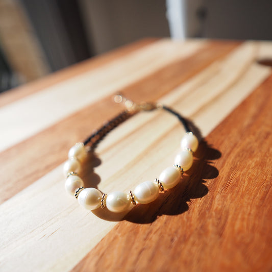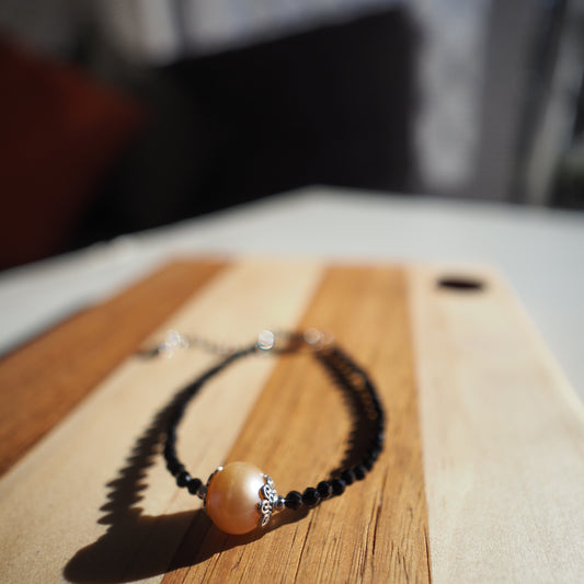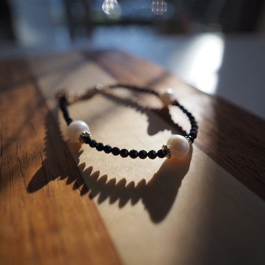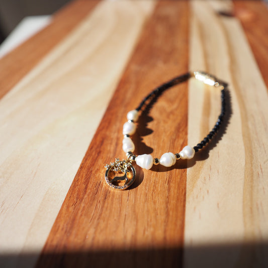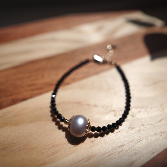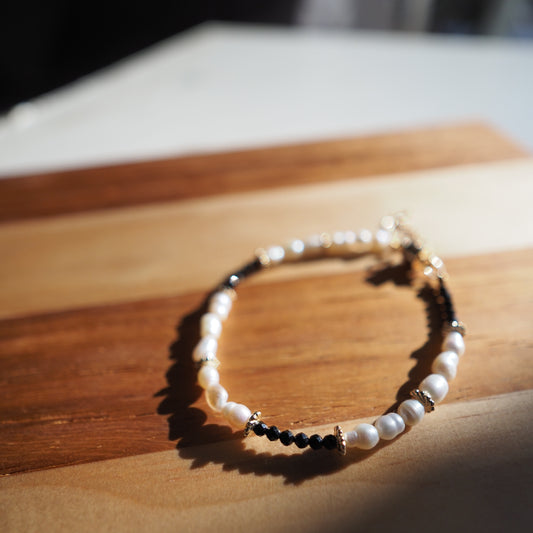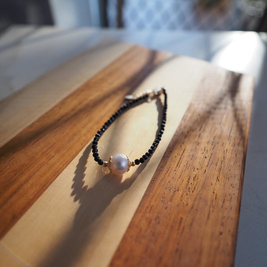 Black Spinel and Freshwater Pearl Bracelet, 14K Gold Plated