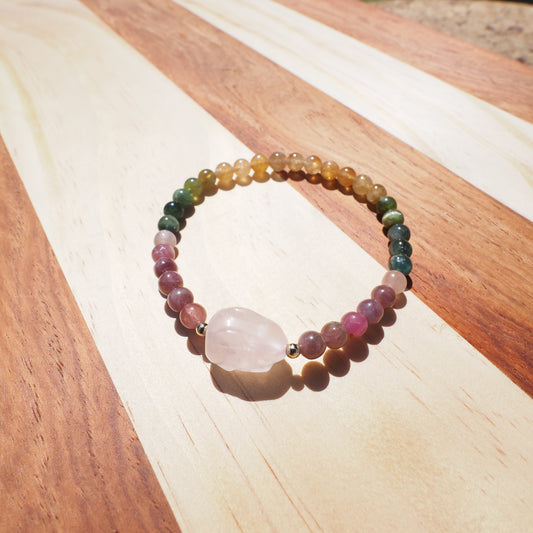 Natural High Quality Rainbow Color Tourmaline with Rose Quartz Rabbit Bracelet 5mm