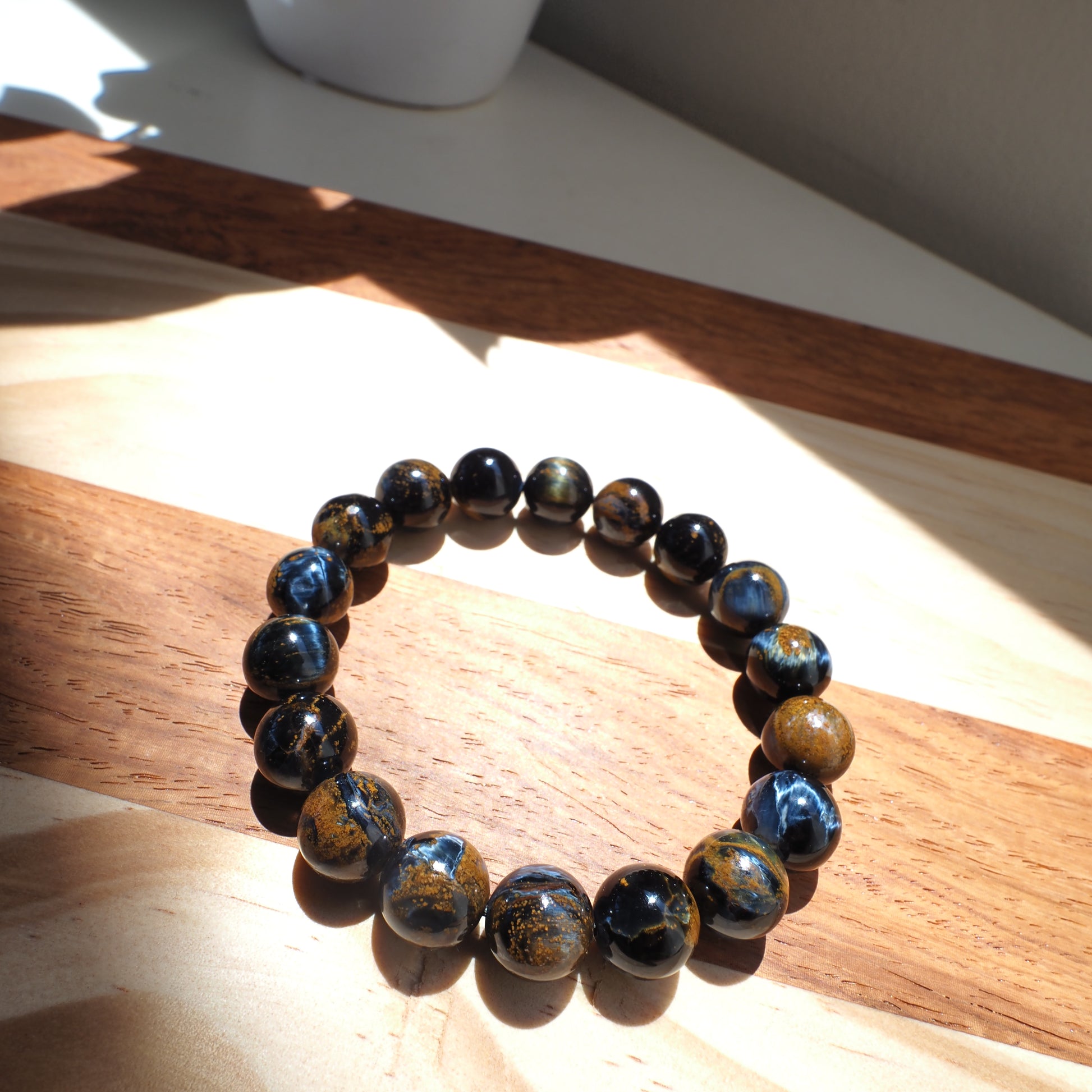 This bracelet is crafted with 11mm natural pietersite beads, showcasing its unique and stunning blue and brown pattern. Pietersite is known to possess protective energy that encourages personal growth and inner strength. Expertly made with genuine and natural materials, this bracelet is a must-have accessory.