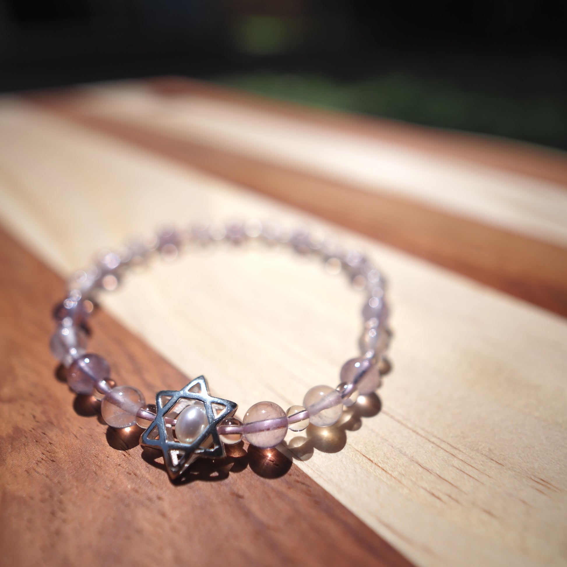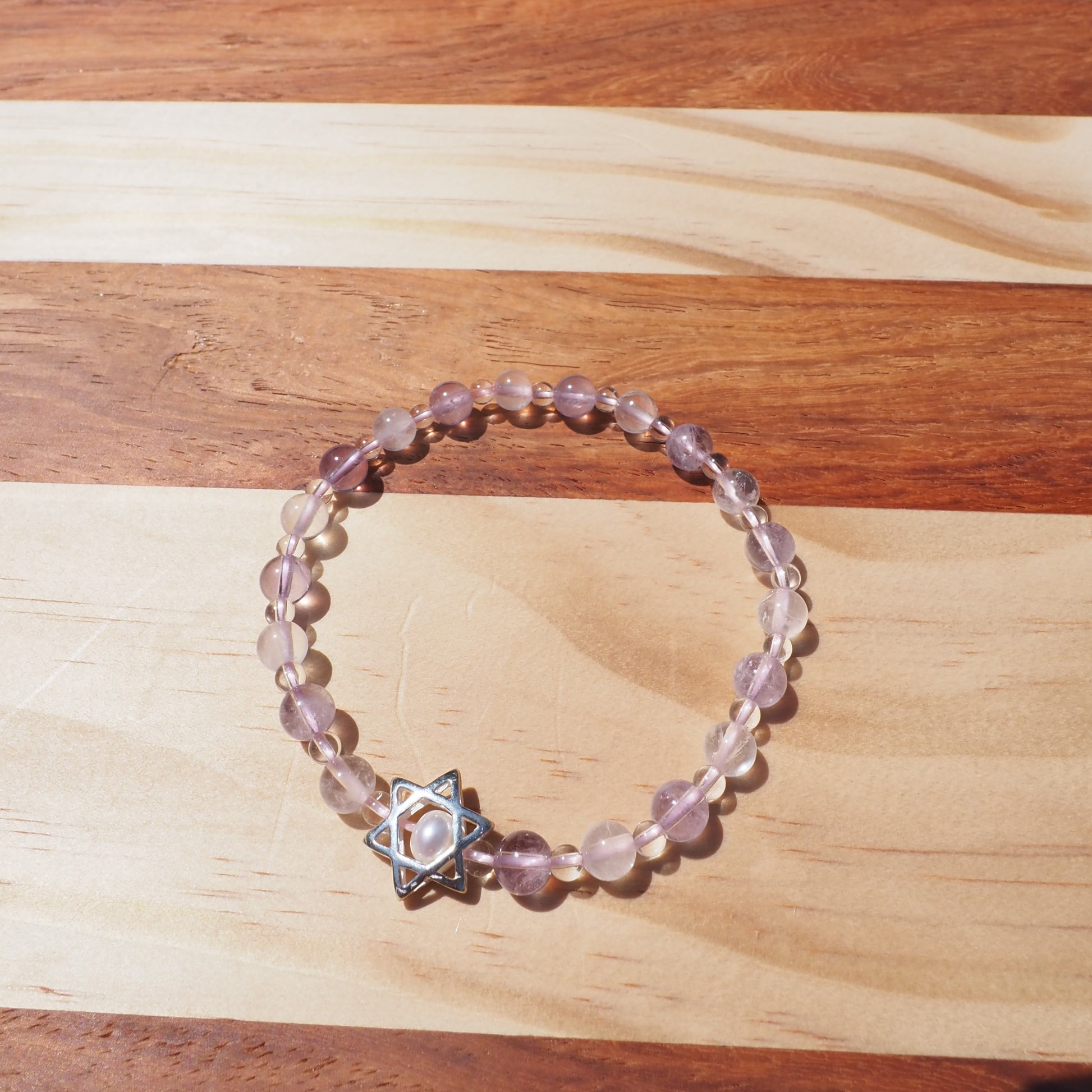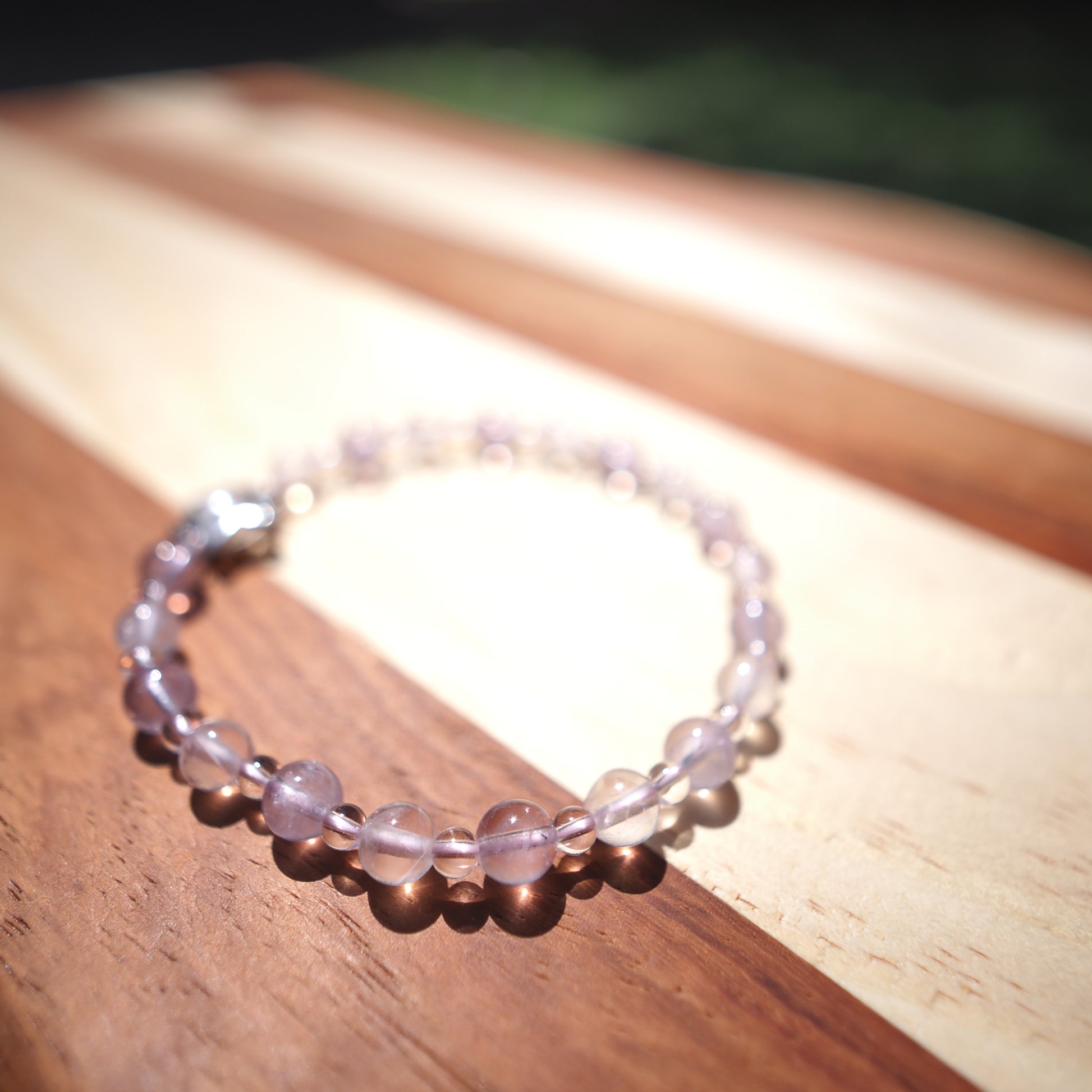 Shimmer and shine with this stunning 5.5mm bracelet made of natural lavender amethyst, rose quartz, and clear quartz. Bring positive energy into your life with the healing properties of these powerful stones. A fashionable and fun addition to any outfit!(don't you just love the pun?)