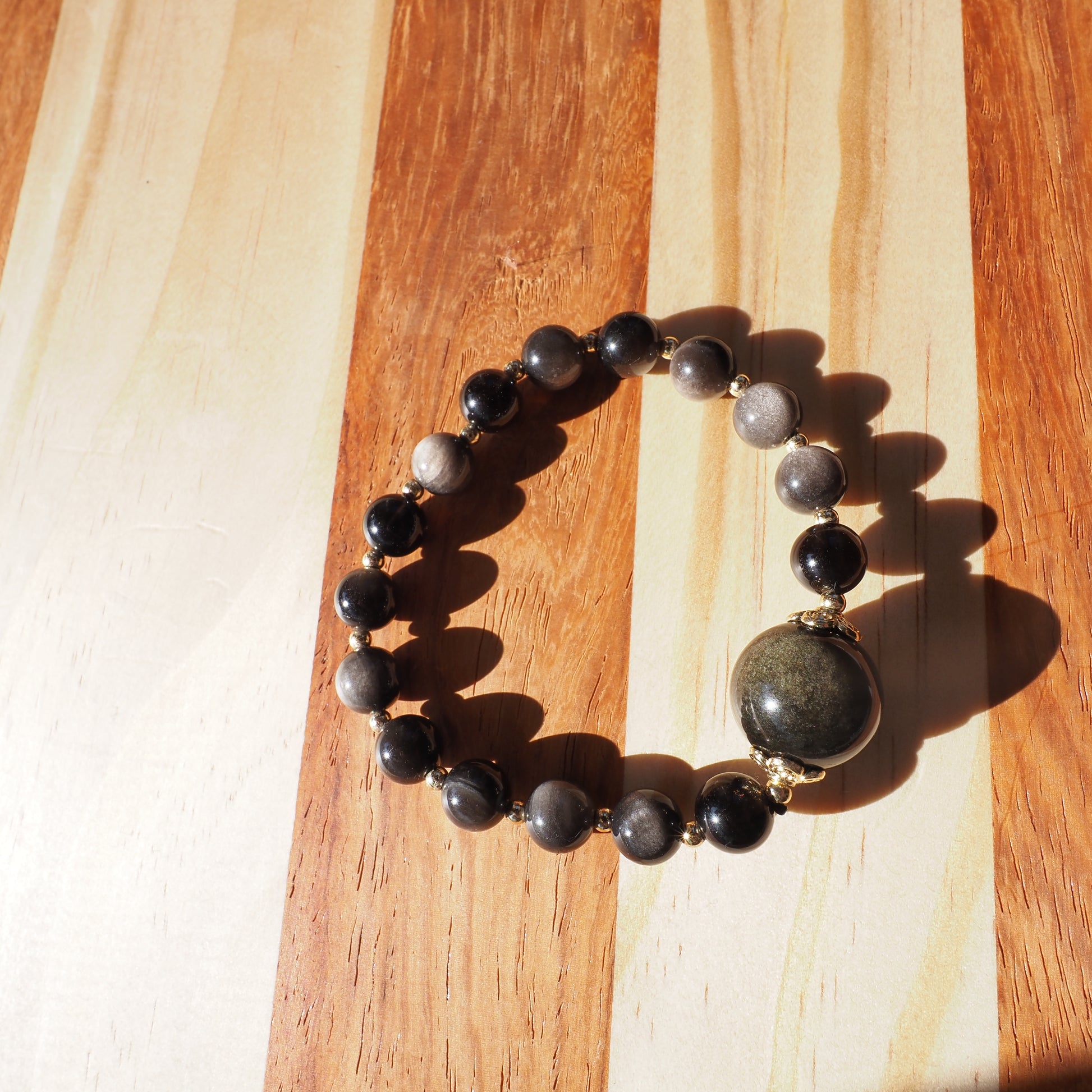 The Natural Rainbow Obsidian with 16mm Round Gold Obsidian Bead Bracelet is a stunning piece that showcases the unique beauty and powerful properties of obsidian gemstones. Crafted with 8mm round beads of natural rainbow obsidian, this bracelet features a captivating array of colors, including deep blacks, shimmering greens, and hints of brown. Each bead is distinct, showcasing the natural variations in the stone that make it truly one-of-a-kind.